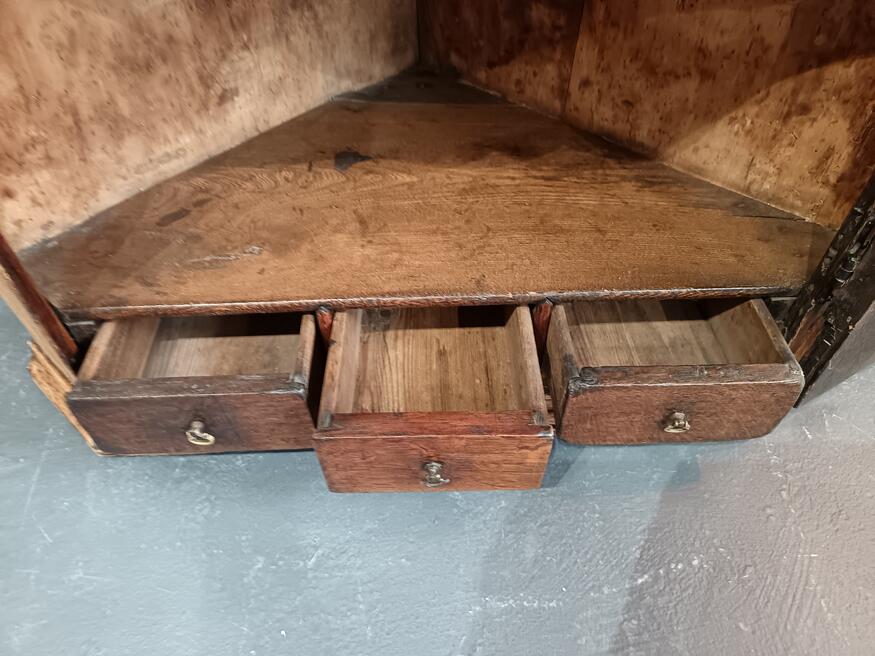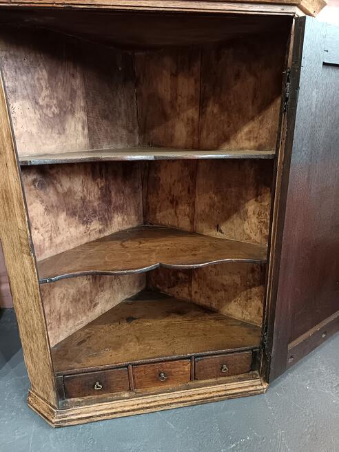 Georgian Oak Corner cupboard. ref 1243Price £195.00 Size Guide (W)73cm. (D)42cm. (H)92cm. *All original. *Delivery locally foc. Circa 1760 onwards a lovely colour to the old oak timber, with a lovely surprise when opened with three drawers for trinkets and two useful shelves all original Fits snugly against your wall , suitable for all spaces. FOR SALE BREAD STREET PENZANCE TR18 2EQ CORNWALL. |