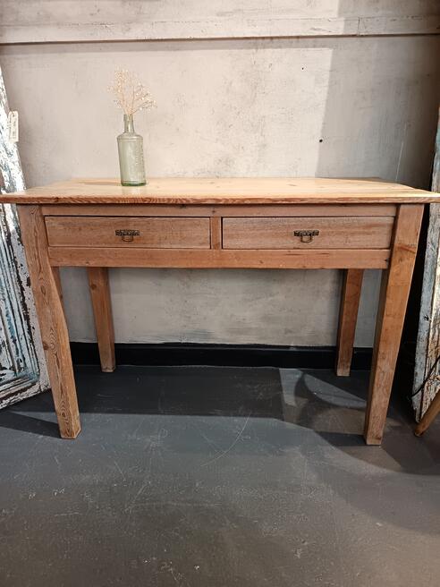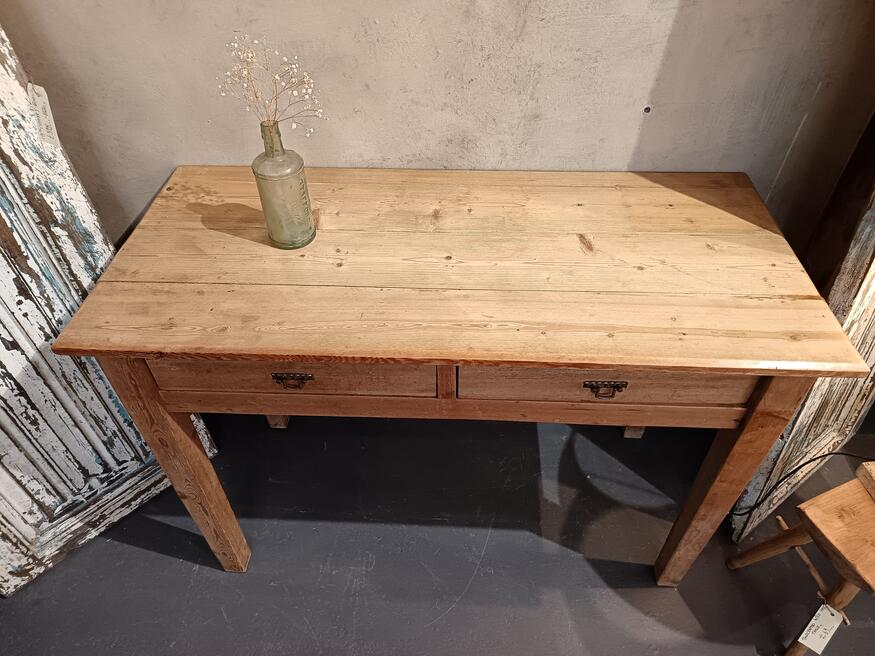 19th C pine desk/table ref 1247. SORRY SOLDPrice £275.00 Size Guide (W)108cm. (D)48.5cm.(H)66cm. A lovely restored old pine table with two easy flowing drawers , tapered square legs blonding pine with no nasty red wood stains not forgetting the beautiful original gold swing handles. Suitable for all spaces in your home . FOR SALE BREAD STREET PENZANCE TR18 2EQ CORNWALL. |