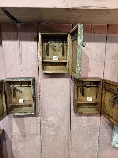 Wall-mount key station. ref 0501Price £45.00 each. Three available. Black one SOLD! Two left. Size Guide (W)18cm. (D)9cm. (H)24cm. Rustic unique key-station cupboard very useful and accompaniment to your country home vibes ! Suitable for bathrooms and kitchens. FOR SALE BREAD STREET PENZANCE TR18 2EQ CORNWALL |