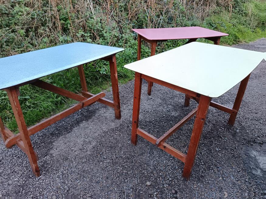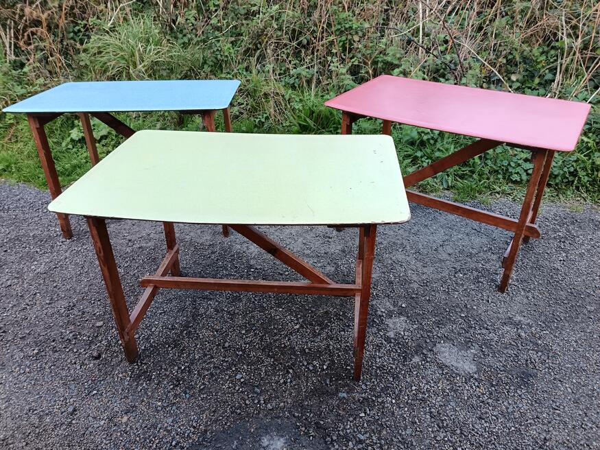 Vintage Formica Tables. ref 0505Size Guide 92x61cm. (H)64cm. *First time to the market. *Very rare. *Sourced private locally. Original untouched vintage tables , three available in blue/red/yellow. Great looks! Stable and very useable, from the 1950's . Suitable for all spaces . FOR SALE BREAD STREET PENZANCE TR18 2EQ CORNWALL. Enquiries 07855 240896. Matt. |