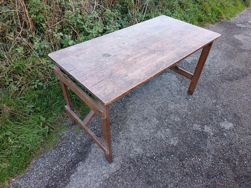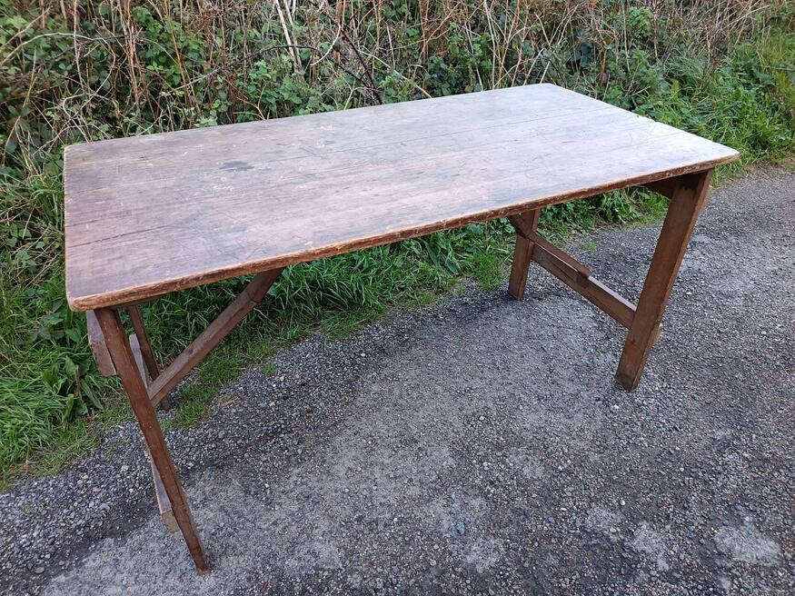 Trestle Table. ref 0502. SORRY SOLDPrice £195.00 Size Guide 150x67cm. (H)76cm. *First time to the market. *Fully serviced. *Can deliver locally foc. *Wax finish. *Fold away table. A original vintage Pine folding trestle Table , natural pine top nice and sturdy. Suitable for all spaces. FOR SALE BREAD STREET PENZANCE TR18 2EQ CORNWALL. |