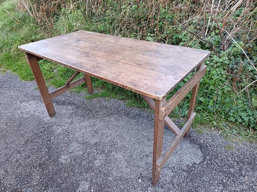 Trestle Table. ref 0503Price £195.00 Size Guide 136x68cm. (H)76cm. *Fully serviced. *Fold away table. *Rare item. *FREE local delivery. A lovely original pine untouched table very sturdy great dimensions, first time to the market wax finish. Ideal for desk. FOR SALE BREAD STREET PENZANCE TR18 2EQ CORNWALL. |