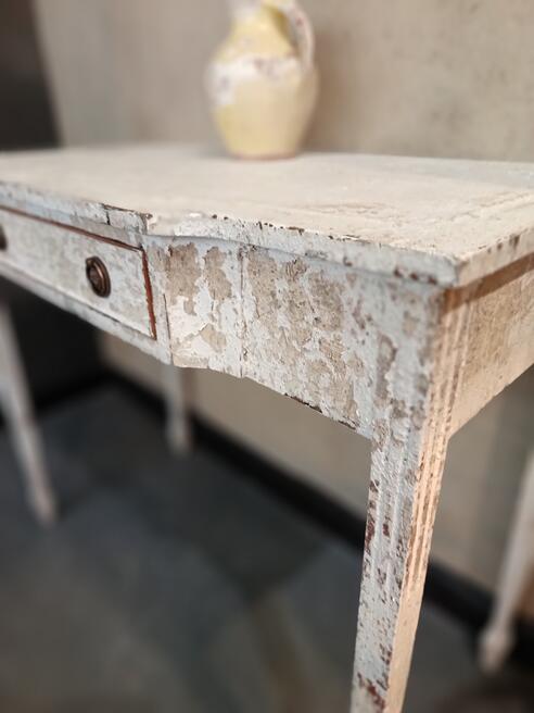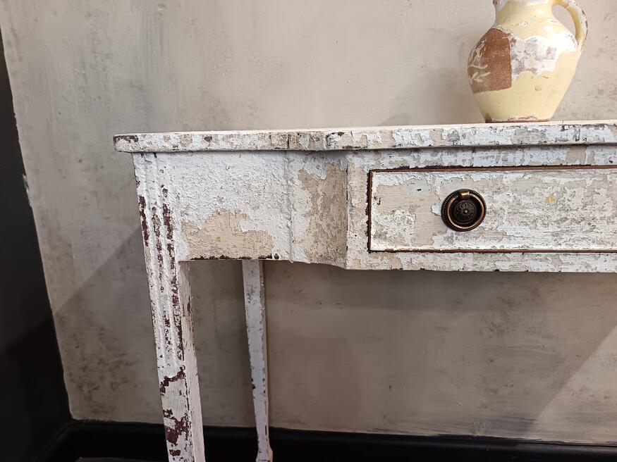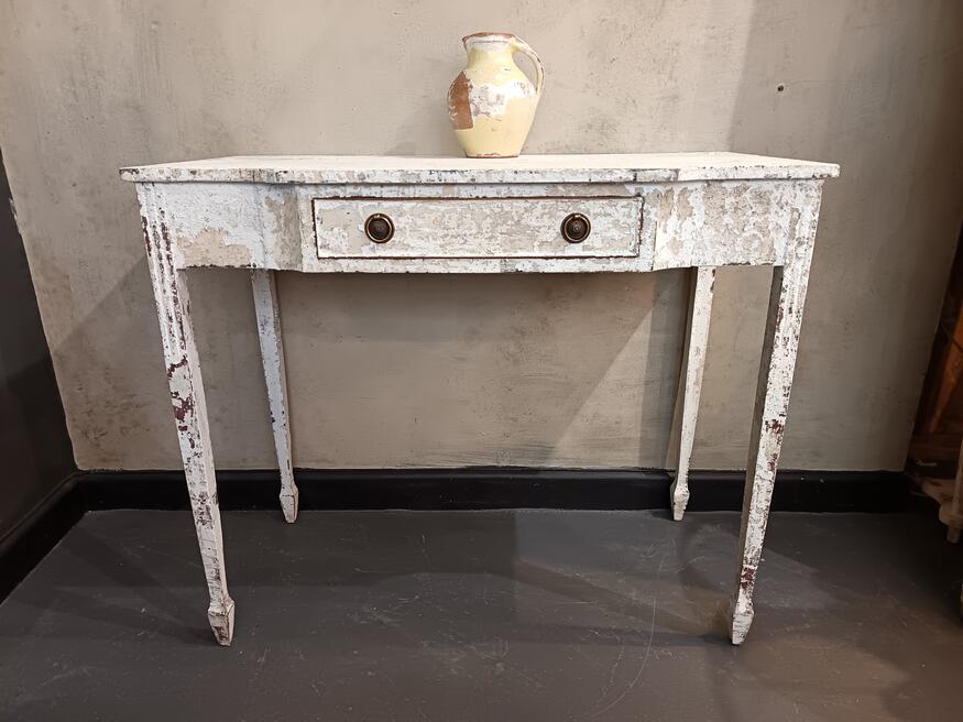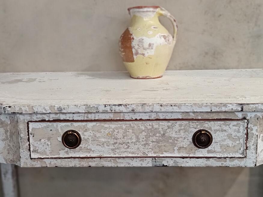Painted Console/dressing table. ref 0523Price £175.00 Size Guide (W)92cm. (D)46cm. (H)77cm. (Leg room) 64cm. This dainty table has gone all romantic and classical with it's authentic flaky paint finish with warm soft colour palette. Useful little draw with plenty of leg room. Suitable for all spaces. FOR SALE BREAD STREET PENZANCE TR18 2EQ CORNWALL |