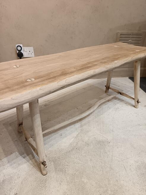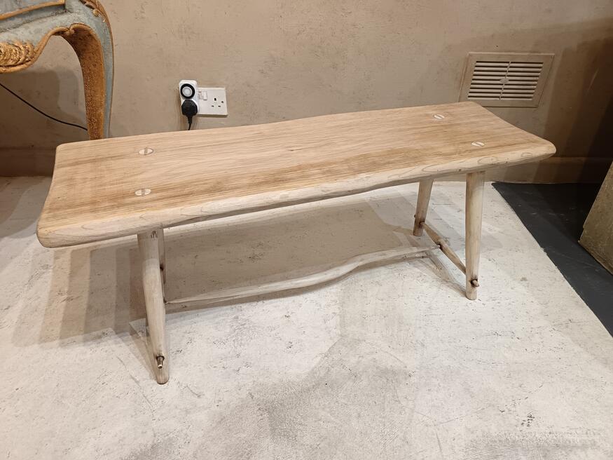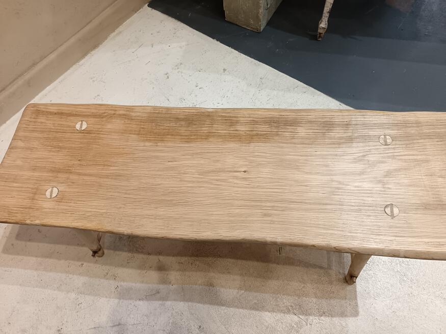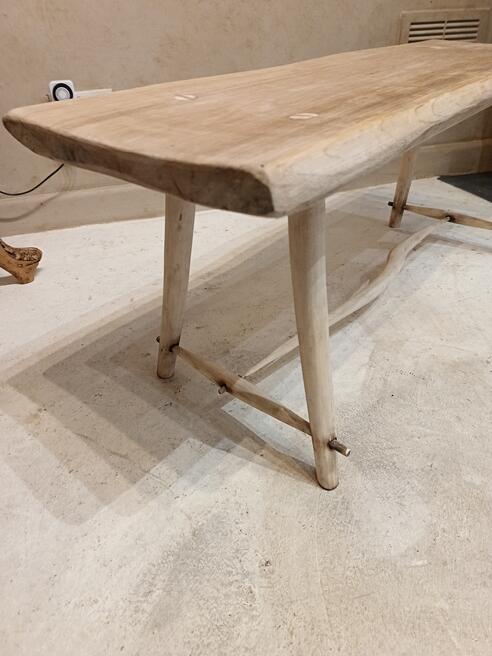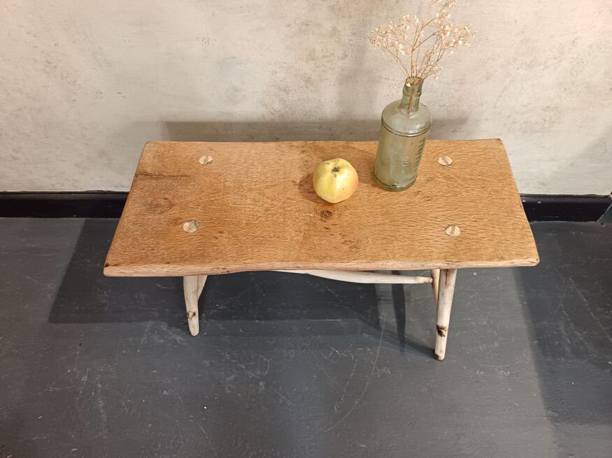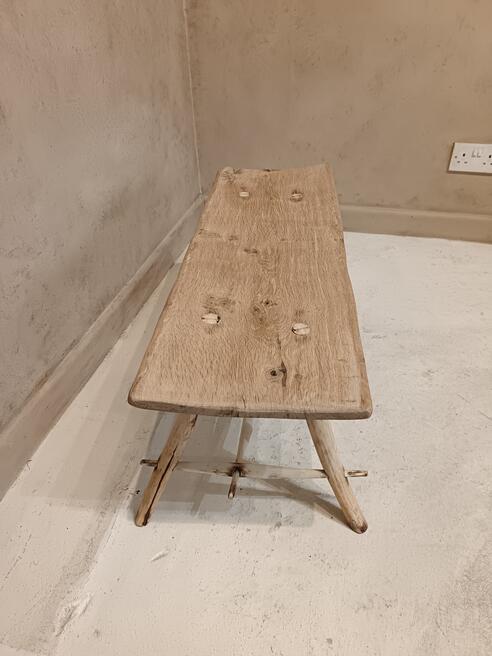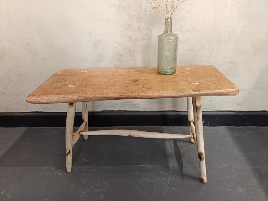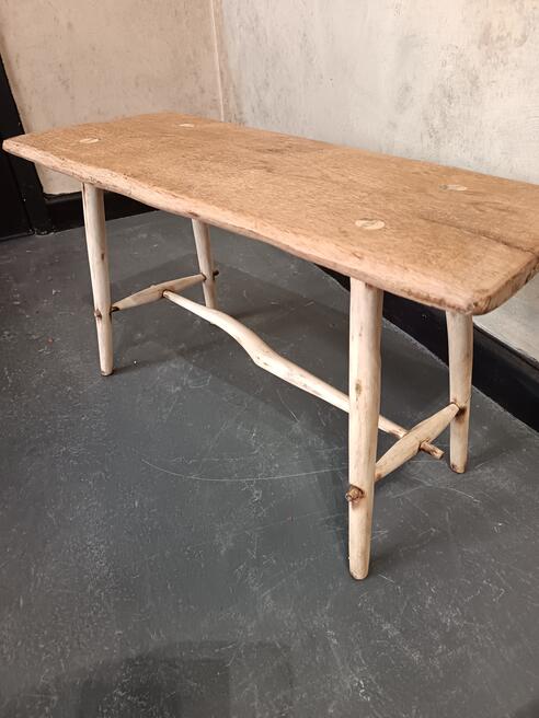 Handcrafted Coffee Table. ref 0542. SORRY SOLDPrice £165.00 Size Guide 97x32 cm. (H)39cm. Woodcraft vibes less measured more joyest straight from a Cornish workshop, oak table top elevated on willow legs natural colour of the blonding timber with exposed joinery and wood grain pattern. Will suit modern antique and traditional decors. FOR SALE BREAD STREET PENZANCE TR18 2EQ CORNWALL. |